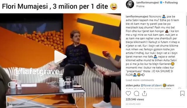 Flori Mumajesi i merr 3 milion në një ditë”, deklaroi Sabriu në një emision disa ditë më parë. E kjo deklaratë nuk i ka ikur as Florit, i cili e shpërndau videon dhe reagoi në Instagramin e tij personal.