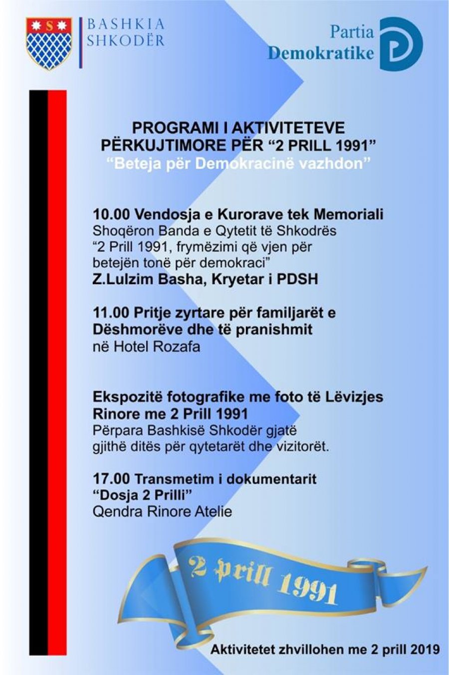 Kryetari i Partisë Demokratike Lulzim Basha ndodhet në Shkodër, aty ku përmes një ceremonie përkujtimore për lëvizjen rinore të 2 Prillit 1991, do të sjellë në vemendje lëvizjen në të cilën dhanë jetën, të vrarë nga diktatura, 4 të rinj shkodranë, Arben Broci, Bujar Bishanaku, Besnik Ceka dhe Nazmi Kryeziu.