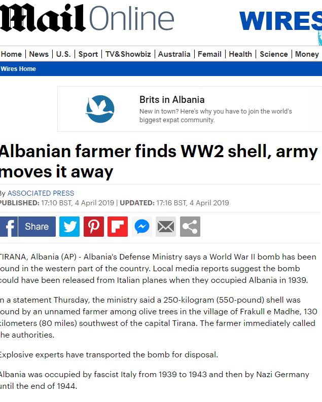 Mediat e huaja prestigjoze si Asociatedd Press dhe Daily Mail kanë shkruar për gjetjen e një bombe të kohës së Luftës të Dytë Botërore në fshatin Frakull e Madhe të Shqipërisë.