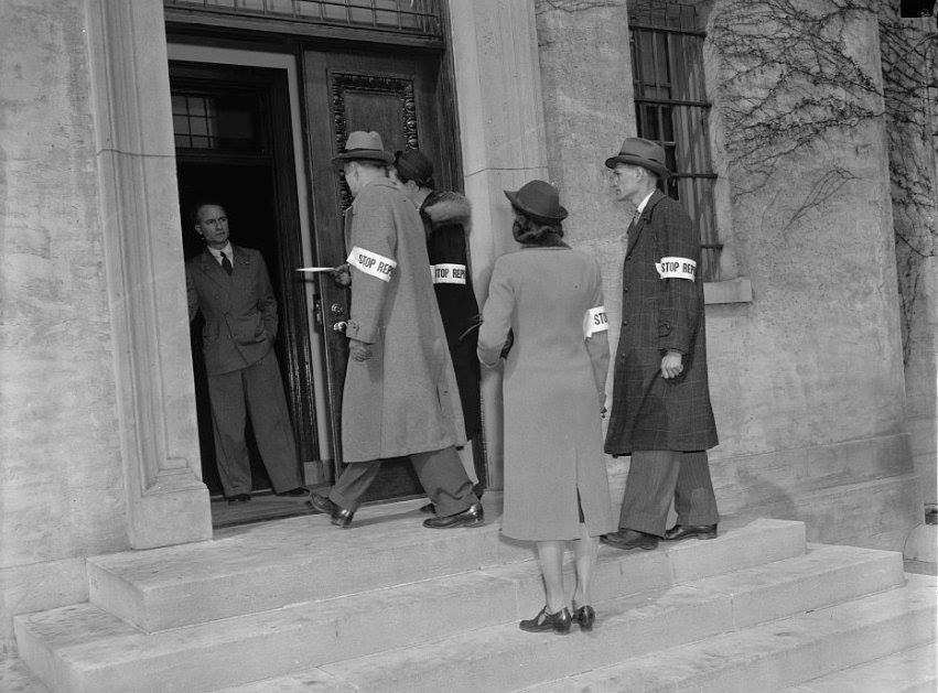 Ne foto, amerikanë që protestojnë në ambasadën italiane në Uashington më 7 prill 1939, ditën e pushtimit të Shqipërise