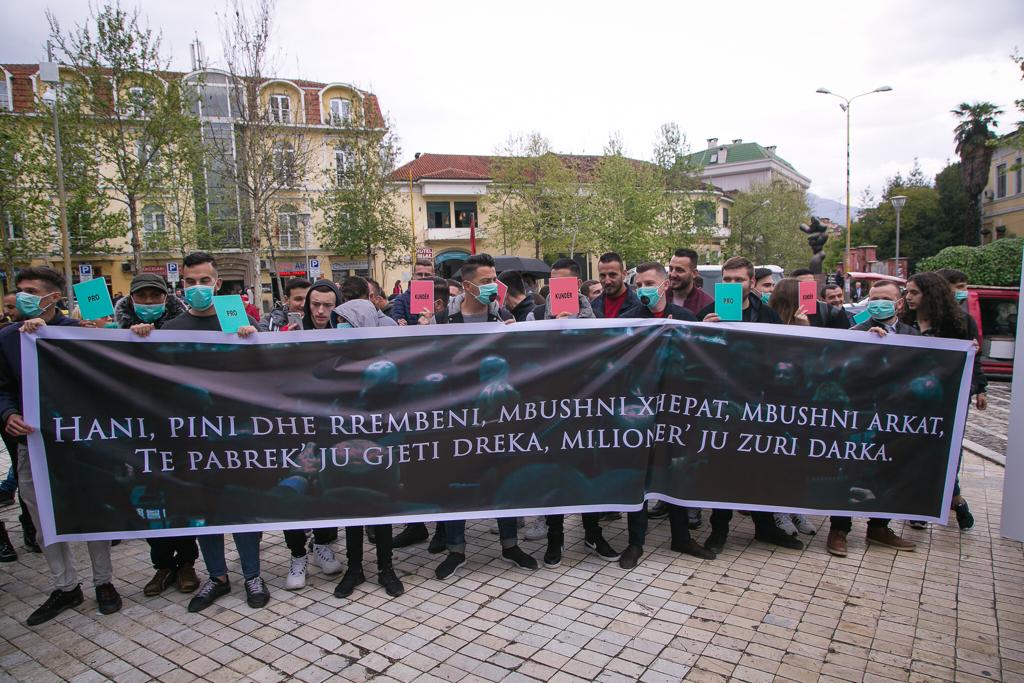 “Hani, pini dhe rrëmbeni, mbushni xhepat, mbushni arkat, të pabrekë ju gjeti dreka, milionerë ju gjeti darka”, “Parlament i krimit”, janë disa slogane te shkruara ne pankartat e tyre.