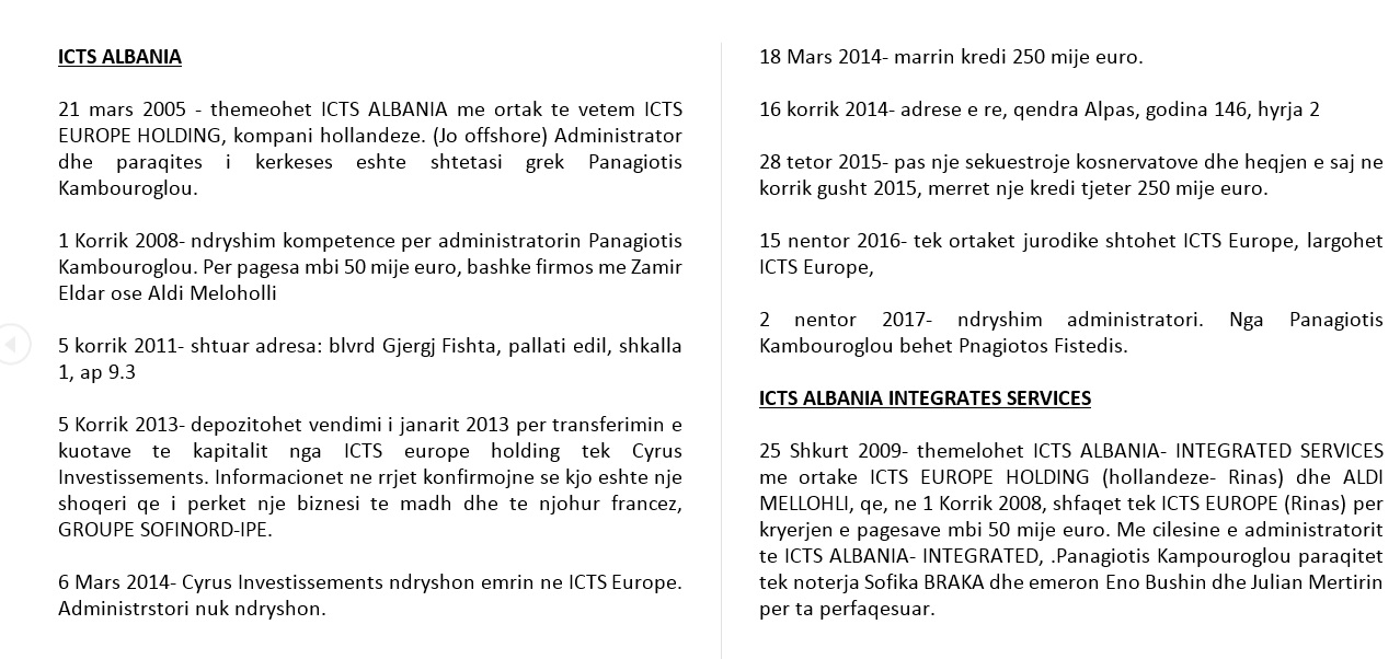 2. Të dyja kompanitë, njëra e themeluar në shkurt 2005, tjetra në Mars 2009, janë rregjistruar nga i njëjti person. Panagiotis Kambouroglou. Në 2009, shtetasi grek autorizon si një nga përfaqësuesit ligjorë të shoqërisë, Eno Bushin.