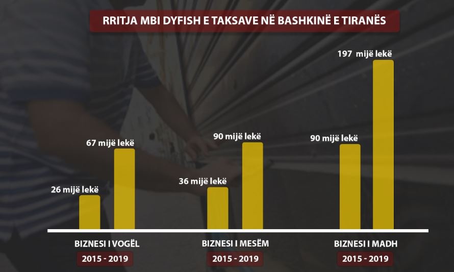 Më konkretisht, një sipërmarrës që zotëron një market të vogël në zonën e Tiranës, paguan 410 mijë lekë më shumë taksa më vit, që prej ardhjes në krye të bashkisë të Erion Velisë. Kjo vlerë është e barabartë me gati sa dy paga minimale.