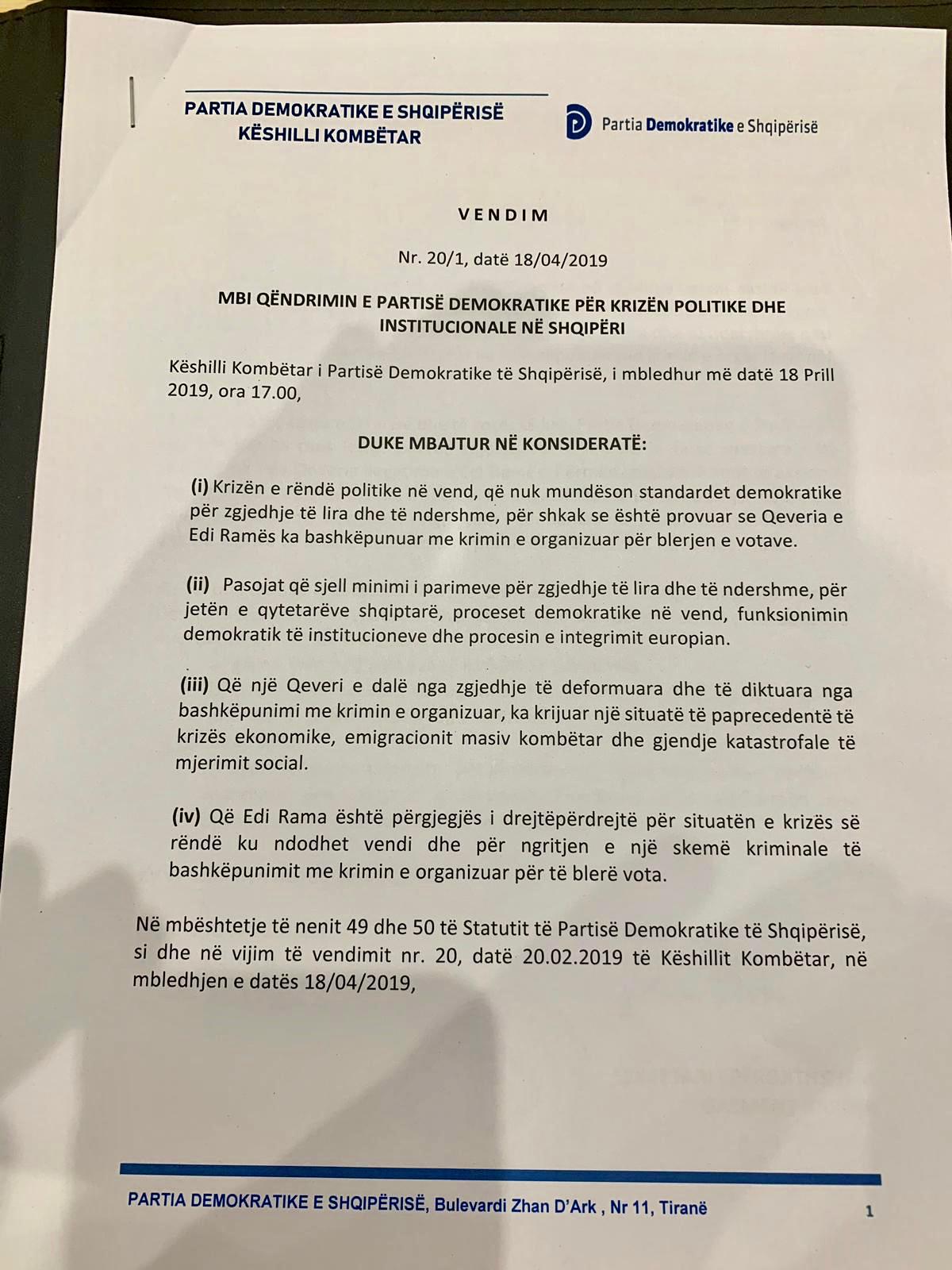 - Në mbrojtje të demokracisë dhe të votës së lirë, Partia Demokratike e Shqipërisë angazhohet të mos lejojë përveç zgjedhjeve të lira asnjë farsë elektorale, të organizuar nga Qeveria ilegjitime e Edi Ramës. Përmes përshkallëzimit të aksionit opozitar, Partia Demokratike e Shqipërisë angazhohet të pamundësojë mbajtjen e zgjedhjeve fasadë, të diktuara nga pakti i Edi Ramës me krimin e organizuar dhe paratë e pista të tyre, shkatërrimtare për demokracinë dhe zgjedhjet e lira.
