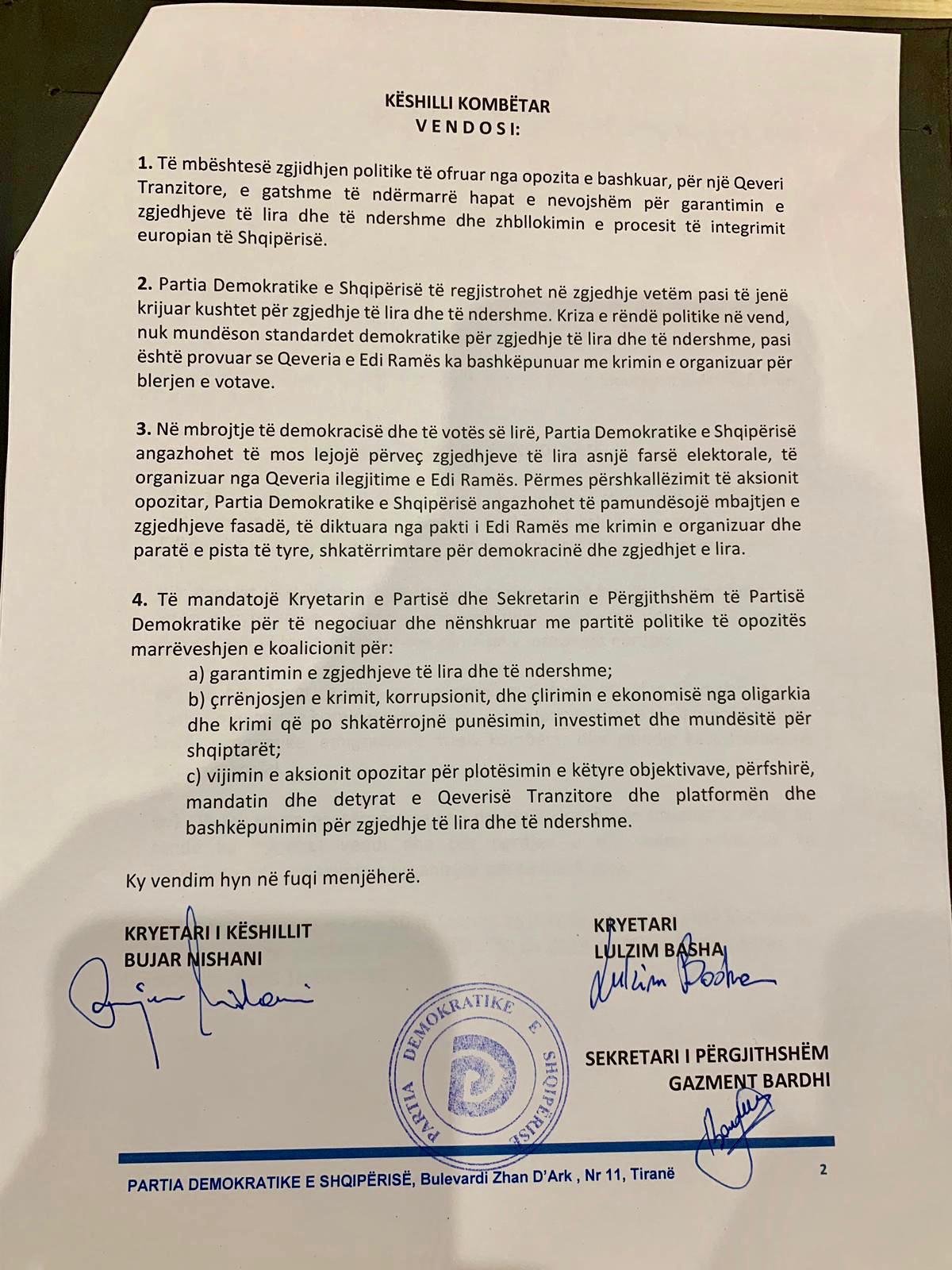 - Të mandatojë Kryetarin e Partisë dhe Sekretarin e Përgjithshëm të Partisë Demokratike për të negociuar dhe nënshkruar me partitë politike të opozitës marrëveshjen e koalicionit për: