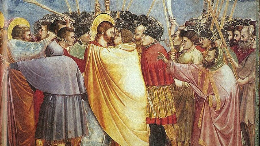 Ungjijtë e Mateut, të Markut dhe të Lukës, specifikojnë se Juda e vuri në dukje Jezusin, duke iu afruar dhe puthur në faqe, kur u afruan ushtarët të shoqëruar nga një turmë njerëzish. Pastaj ata e çuan Jezusin tek Ponc Pilati, guvernatori romak i Judesë. Jezusi u nxorr në gjyq, dhe më pas u kryqëzua.