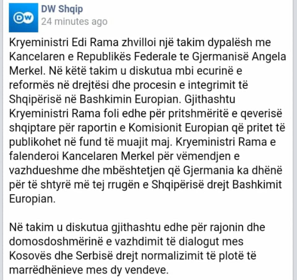Faqja zyrtare e DW Shqip ka edituar statusin ne Facebook ku fliste për takimin mes kryeministrit Rama dhe kancelares gjermane Angela Merkel.