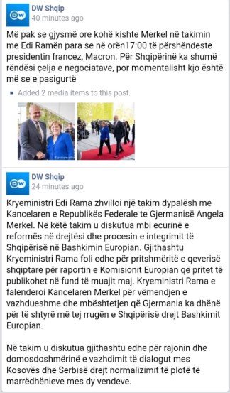Më pak se gjysmë orë kishte Merkel në takimin me Ramën para se në orën 17.00 të përshëndeste Presidentin Francez Macron. Për Shqipërinë ka shumë rëndësi çelja e negociatave, por momentalisht kjo është e pasigurtë”, shkruante fillimisht DW, mirëpo pak minuta më vonë, ky postim u redaktua, duke ndryshuar kohëzgjatjen e takimit, siç duket edhe në postimin e mëposhtëm.