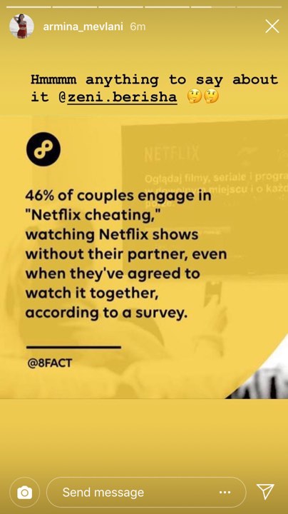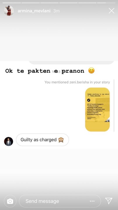 “46% e çifteve përfshihen në ‘Tradhti Netflix-i’. Ata shikojnë shfaqje të ndryshme në ‘Netflix’ pa partnerin/ partneren edhe pse e kanë planifikuar paraprakisht ta shohin bashkë”,-thuhet në studimin në fjalë. Krahas fotos, Armina e pyet të fejuarin nëse ka ndonjë gjë për të thënë. Përgjigja e tij nuk vonon dhe është e shkurtër dhe e saktë: “Jam fajtor”.
