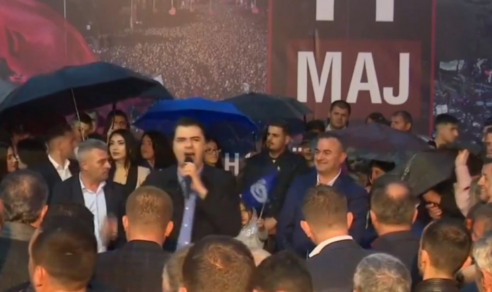 “Ndonëse në këtë shesh valëviten flamuj të PD ka edhe vëllezër e motra socialist mallakstriotë që nuk kanë gjë të përbashkët me rilindjen që i braktisi dhe i mashtroi. Edhe socialistët kanë të njëjtat halle si demokratët, paguajnë të njëjtat çmime të rritura, por janë dyfish të zhgënjyër se sollën në pushtet një njeri që e ndau pushtetin me krimin. 11 maji është parathënia për bashkimin më të madh të shqiptarëve, tek të cilët ka lindur shpresa dhe besimi se së bashku do të rrëzojmë Shqipërinë e frikës dhe do të ndërtojmë Shqipërine e shpresës.