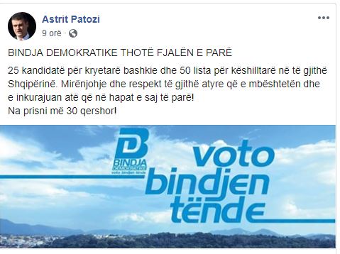 Bindja Demokratike ka regjistruar në KQZ 25 kandidatë për Kryetar bashkie dhe 50 lista për këshilltarë në të gjithë Shqipërinë.Bindja ka zgjedhur Arben Skënderin për në kryeqytet, ish anëtar i kryesisë së PD-së dhe anëtar në këshillin kombëtar të PD-së.