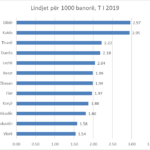 Qarku me numrin më të ulët të lindjeve në raport me popullsinë është Vlora, që në tremujorin e parë shënoi 1.54 lindje për 1000 banorë, ndërsa para saj renditet Gjirokastra (1.58), dhe Shkodra (1.8)- shiko grafikun: “Lindjet për 1000 banorë, T I 2019”.