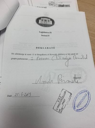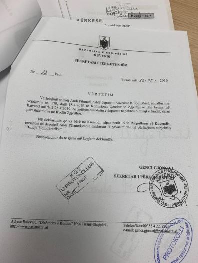 Në një akt të paprecedentë, për llogari të Edi Ramës, Sekretari i Përgjithshëm i Kuvendit ka falsifikuar dokumentet zyrtare, duke lëshuar për partinë fantazëm të Edi Ramës një vërtetim, sikur përfaqësohet në Kuvend nga një deputet që ka 6 muaj që ushtron mandatin e tij. Bëhet fjalë për deputetin Andi Përmeti, i cili nuk ka mbushur as 1 muaj në marrjen e mandatit.