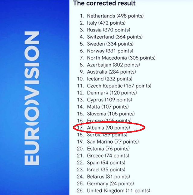 Lajmin e ka publikuar faqja zyrtare e Eurovizionit, duke lajmëruar se pas rillogaritjes së pikëve, renditja ka ndryshuar. Pas numërimit të votave edhe një herë,Shqipëria u rendit në vendin e 17-të.