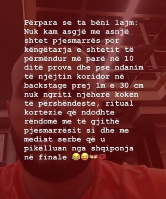 “Përpara se ta bëni lajm: Nuk kam asgjë me asnjë shtet pjesmarrës, por këngëtarja e shteti të përmendur më parë në 10 ditë prova dhe pse ndanim të njëjtin korridor në backstage prej 1 metër e 30 centimetër nuk ngriti njëherë kokën të përshëndeste, ritual kortezie që ndodh rëndomë me të gjithë pjesmarrësit si dhe me mediat serbe që u pikëlluan nga shqiponja në finale”,– shkruan Ardi Asllani në profilin e tij.