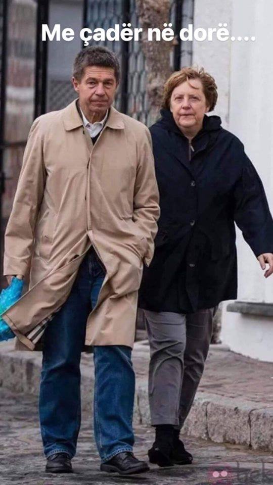 Këtë gjë e ka bërë gazetari Denis Dyrnjaja, i cili ka ironizuar permes një postimi në rrjetet sociale. Dyrnjaja ka publikuar një foto ku kancelarja gjermane, Angela Merkel, shihet e veshur mjaft thjeshte dhe ecën me bashkëshortin e saj me çadër në dorë.