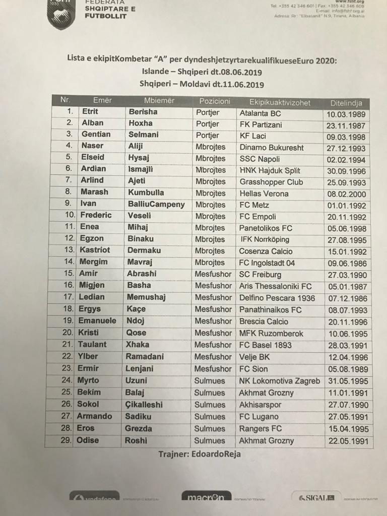 Trajneri i ri i Kombëtares, Edy Reja ka publikuar paraditen e sotme listën e lojtarëve që do të grumbullohen për dy ndeshjet eliminatore të Europianit 2020, më 8 qershor ndaj Islandës në transfertë dhe më 11 qershor ndaj Moldavisë.