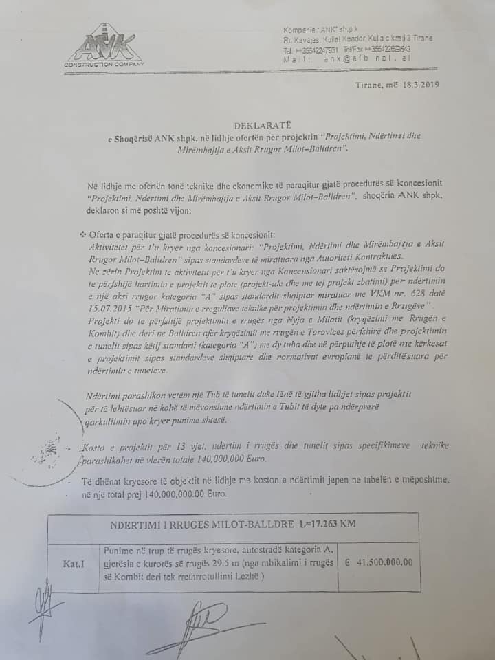 Duke publikuar disa dokumente Shehaj denoncont se kompania ANK bën një ofertë me 140 milionë euro ku përfshihet edhe ndërtimi i një tuneli me vetëm një tub, të gjatë 850 metra, me kosto 17 milionë euro.