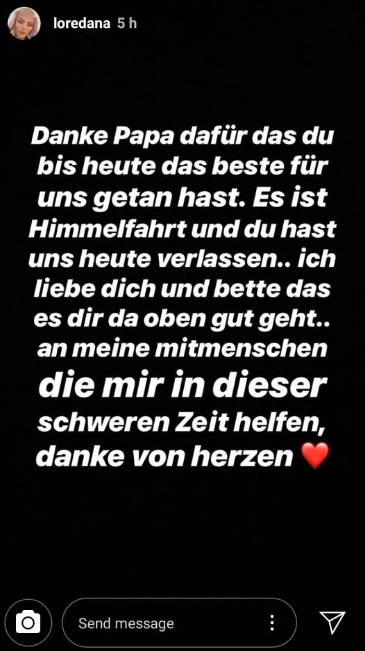 “Faleminderit Baba që deri më sot ke bërë më të mirën për neve. Sot është Dita e Shelbumit dhe sot ike nga ne…Unë të dua ty dhe lutëm për ty ta kesh mirë atje lartë. Për njerëzit e mi që në këto të vështira më ndihmojnë ju faleminderit nga zemra.”, ka shkruar Loredana.
