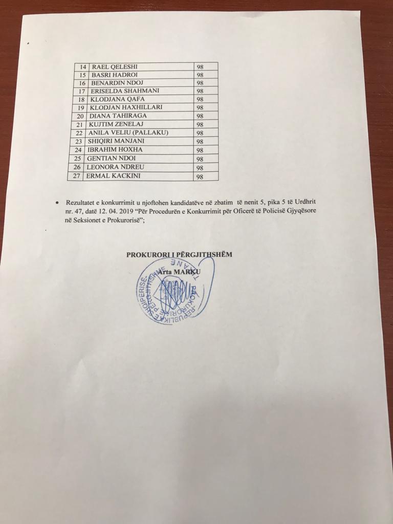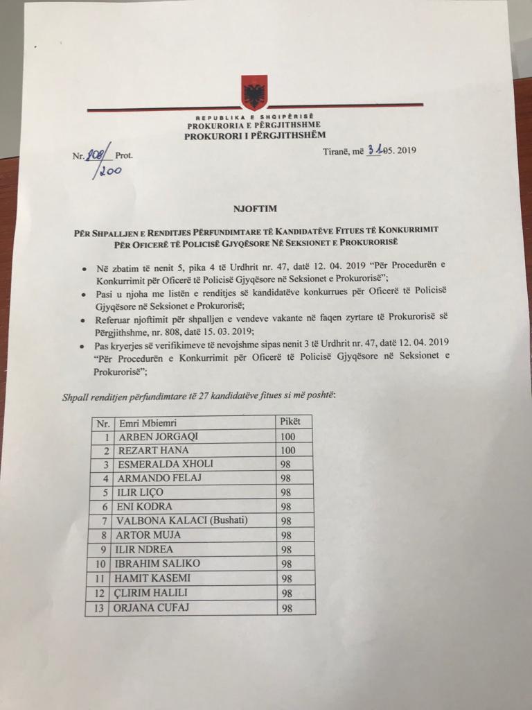 Droni ka siguruar listen edhe pse Prokuroria e Pergjithshme nuk e ka publikuar ate sic e kerkon ligji. Besohet se nderhyrja u be per te favorizuar nje familjar te Ermonela Felaj, vellain e saj. Droni meson se per ta emeruar ne Tirane ka ndryshuar renditja ne rezultatet e konkurist duke e kaluar vellain e ermonela felaj te parin dhe Arben Jorgaqin qe ishte i pari e kane kaluar te katertin duke e emeruar OPGJ tek pergjimet.