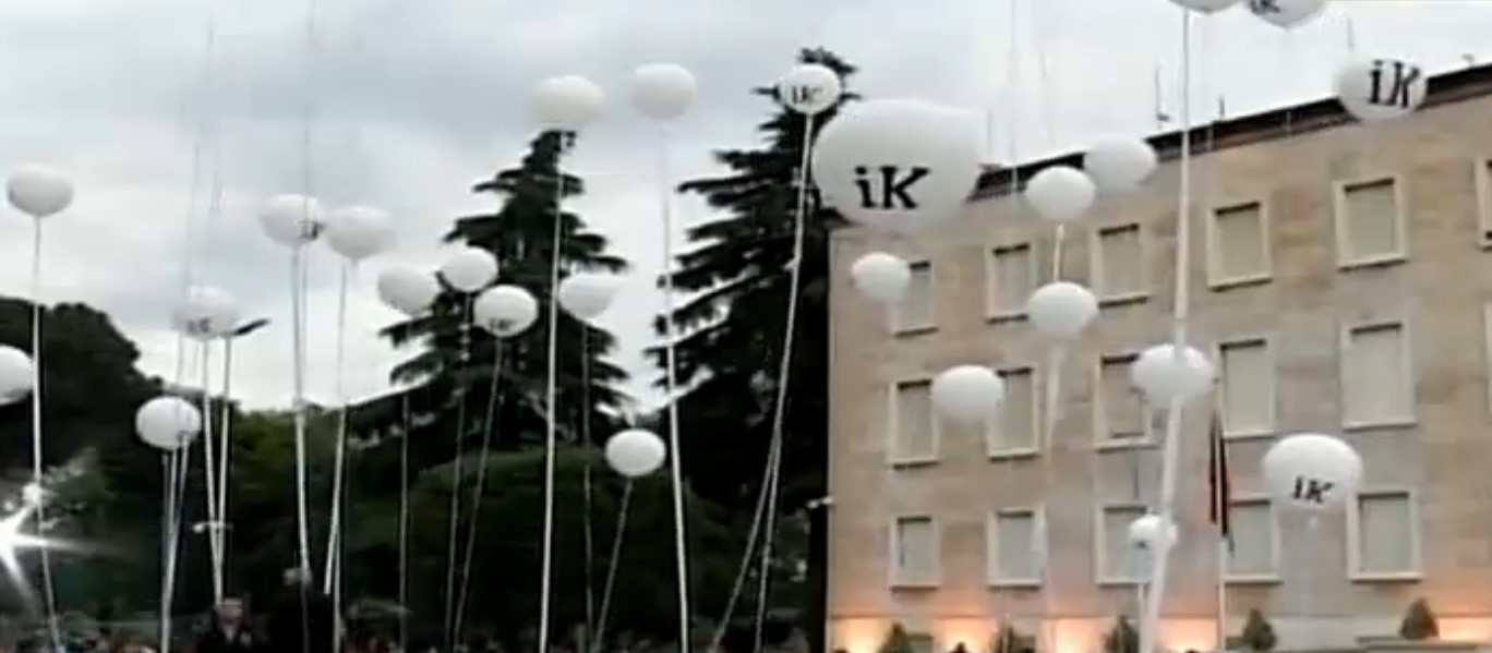 Tullumbacet e ngrituar në ajër mbajnë mbishkrimin ‘Rama Ik’ si një mënyrë simbolike për të kërkuar dorëheqjen e kryeministrit Edi Rama.