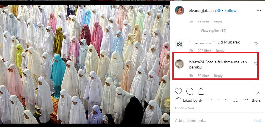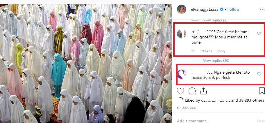 “Bravo @elvanagjataaaa pavarësisht që s’je myslimane, e urove Bajramin në mënyrën më të mirë dhe të sinqertë të mundshme. Yll”.