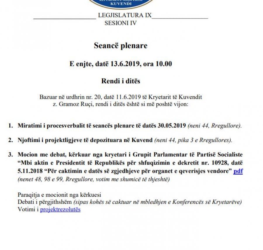 Në axhendë thuhet: “Mocion me debat, kërkuar nga kryetari i Grupit Parlamentar të Partisë Socialiste “Mbi aktin e Presidentit të Republikës për shfuqizimin e dekretit nr. 10928, datë 5.11.2018 “Për caktimin e datës së zgjedhjeve për organet e qeverisjes vendore.”