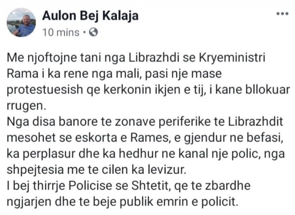 Demokrati Aulon Kalaja ka shkruar në rrjetin social se është njoftuar se eskorta e kryeministrit ka përplasur dhe një polic duke e hedhur në kanal.