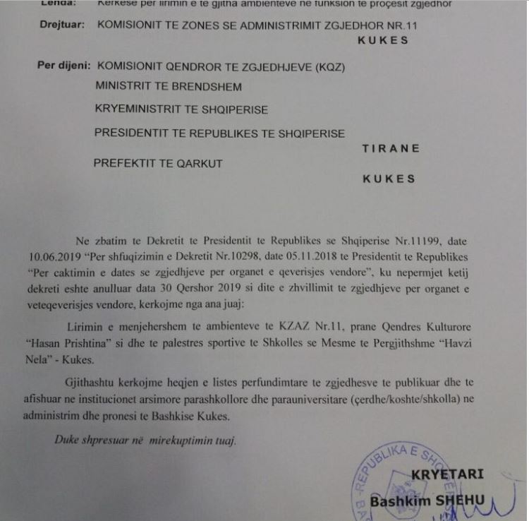 Në një letër dërguar KQZ, kjo Bashki me firmën e Kryetarit të saj, Bashkim Shehu, ka kërkuar heqjen e listave të zgjedhësve të afishuara si dhe për të liruar ambjentet.