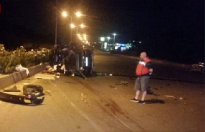 Goditja e parë ka qenë e fortë me nje pjesë betoni, i cili është shkërmoqur ndërsa mjeti ka bërë 4 rrotullime për të përfunduar në mes të rrugës.