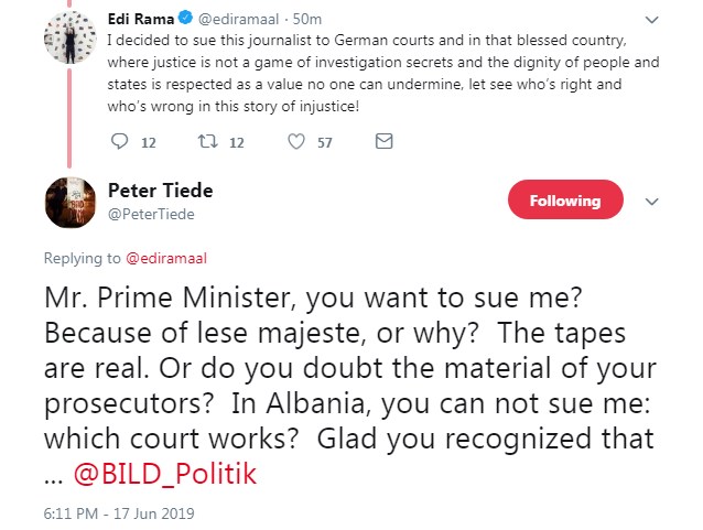Tiede ka ripostuar shënimin në anglisht të Ramës në llogarinë e BILD në rrjetin social Twitter. Gazetari gjerman i drejtohet Ramës duke e pyetur se mos me përgjimet e publikuara sot ka dëmtuar “madhërinë” e tij si dhe i kujton kreut të qeverisë shqiptare se nuk ka ku ta hedhë në gjyq, pasi në Shqipëri nuk punojnë gjykatat.