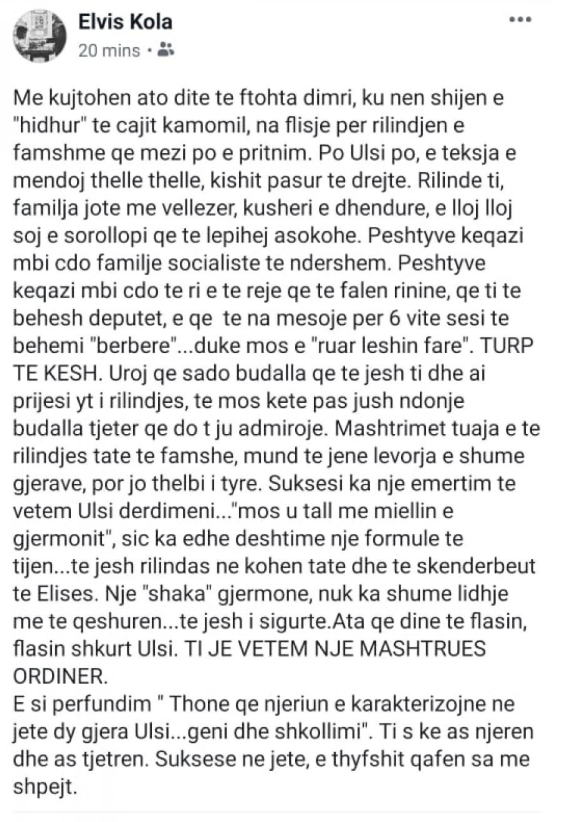 Elvis Kola, dikur kryetar i FRESSH në Dibër, tashmë një inxhinier mekanik i lënë pa punë nga Rilindja I është hakërruar nëpërmjet një statusi në Facebook kryetarit të Komisionit të Ligjeve, Ulsi Manjës.