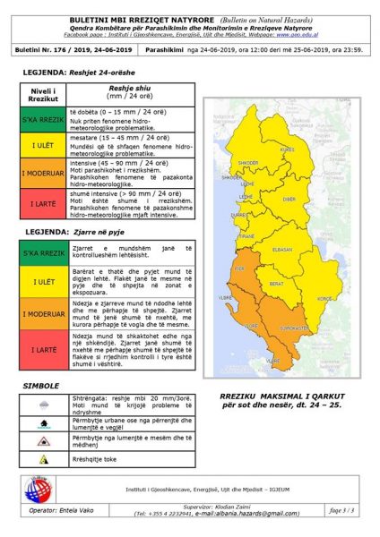 Sot pasdite (e hënë dt.24) dhe nesër (e martë dt.25), në përgjithësi, priten reshje të dobëta, kryesisht të karakterit lokal (siç tregohet në tabelë, respektivisht për secilin qark).