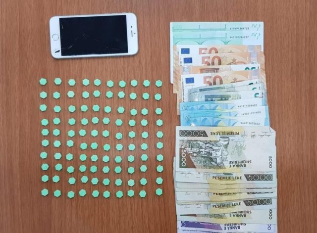 “Gjatë kontrollit, i gjeti 100 kokrra “ekstazi”, drogë stimuluese, si dhe një sasi valute prej 525 eurove dhe 60.000 lekë të rinj, të cilat dyshohen se janë përfituar nga aktiviteti kriminal i shpërndarjes.