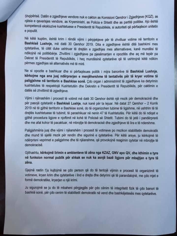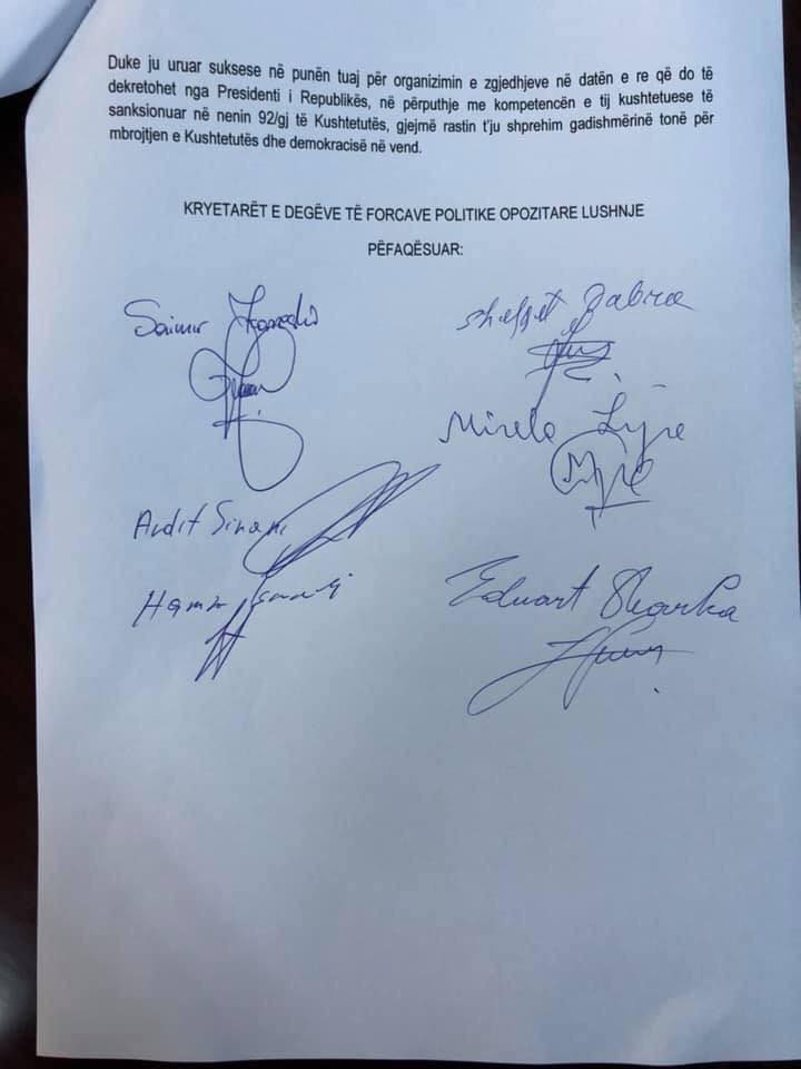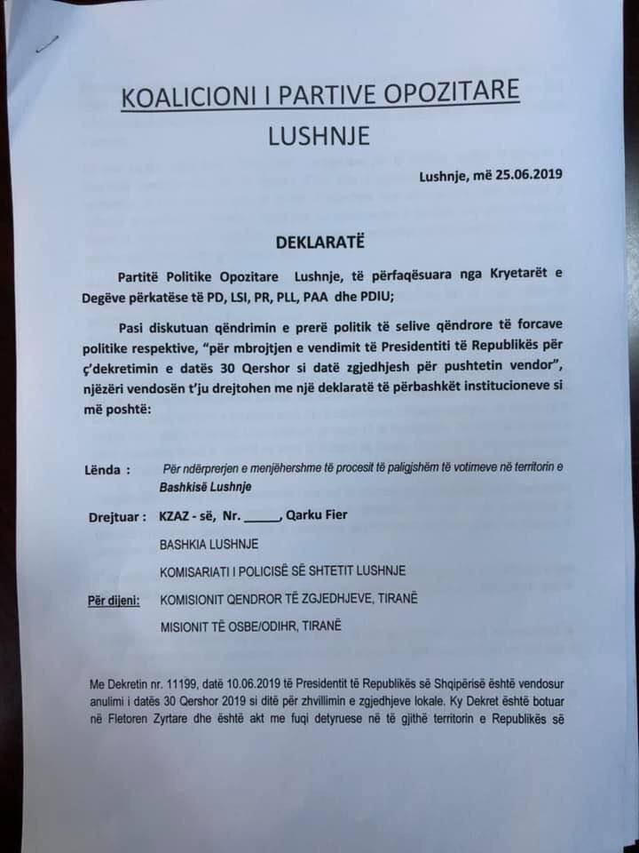 Në qytetin e lushnjes partitë politike opozitare , të përfaqësuara nga Kryetarët e Degëve vendosën një deklaratë duke iu drejtuar institucioneve “Për ndërprerjen e menjëhershme të procesit zgjedhor.