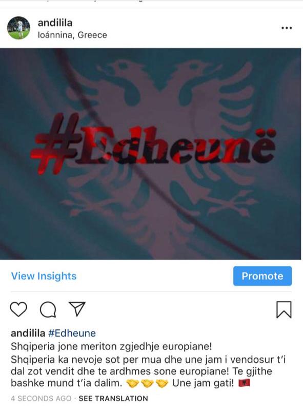 Futbollisti Andi Lila teksa e shoqëron statusin e tij në facebook me flamurin kombëtar, thotë se: “Shqipëria ka nevojë sot për mua dhe unë jam i vendosur t’i dal zot vendit dhe së ardhmes sonë europiane. Të gjithë bashkë mund t’ia dalim. Unë jam gati!”