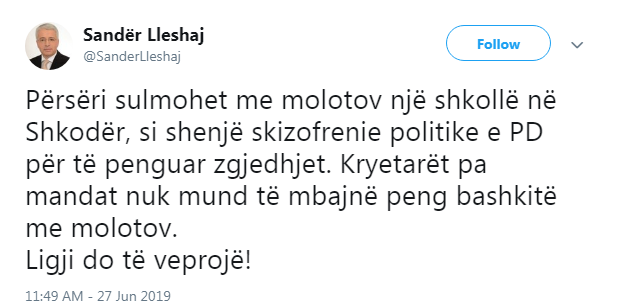 “Përsëri sulmohet me molotov një shkollë në Shkodër, si shenjë skizofrenie politike e PD për të penguar zgjedhjet. Kryetarët pa mandat nuk mund të mbajnë peng bashkitë me molotov. Ligji do të veprojë!”, shkruan Lleshaj.