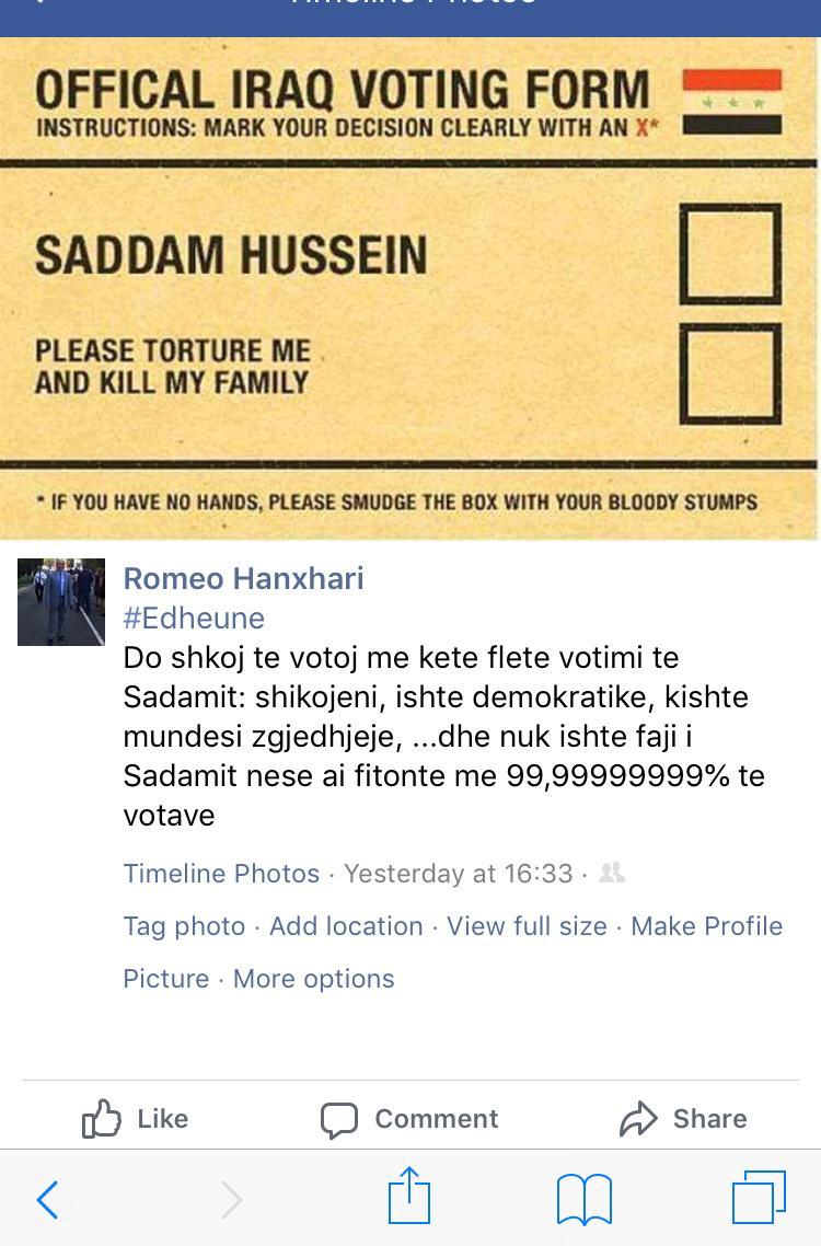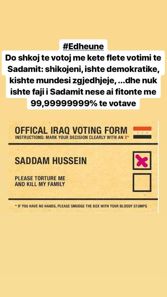“Do të shkoj të votoj me këtë fletë votimi të Sadamit: shikojeni, ishte demokratike, kishte mundësi zgjedhje, dhe nuk ishte faji i Sadamit nëse ai fitonte me 99,9999999999% të votave”, shkruan pedagogu.