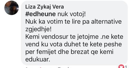 Pedagogja e Universitetit të Vlorës Liza Zykaj, i bashkohet nismës #edheune e cila thekson se “Nuk ka votim të lirë, pa alternativë zgjedhje!” Më tej ajo thekson se “Kemi vendosur të jetojmë në këtë vend ku vota duhet të ketë peshë për fëmijët dhe brezat që kemi edukuar”.