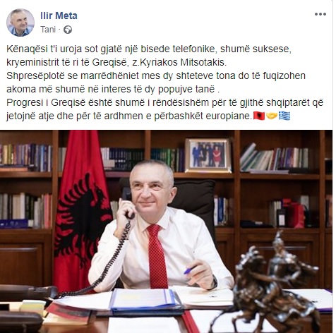 Presidenti i Republikës së Shqipërisë, Ilir Meta ka zhvilluar sot një bisedë telefonike me kryeministrin e ri të Greqisë, Kyriakos Mitsotakis.