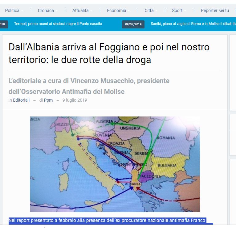 Mediat italiane vazhdojnë të shkruajnë për trafikun e drogës që bëhet mes Shqipërisë dhe Italisë. Në shkrimin e mediave fqinje thuhet se në raportin e paraqitur në shkurt në prani të ish-prokurorit kombëtar të antimafies Franco Roberti dhe avokatit të përgjithshëm të Campobasso Guido Rispoli rezultoi se mafiet në Molia ndryshojnë nga njëra-tjetrën dhe secila vepron në sektor të veçantë.