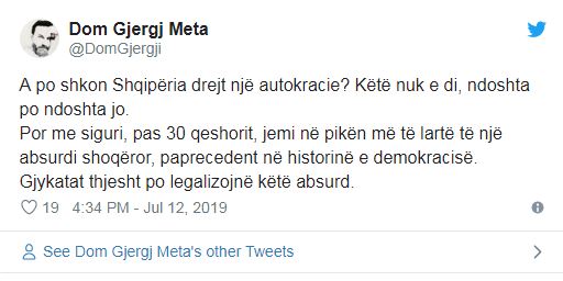 “A po shkon Shqipëria drejt një autokracie? Këtë nuk e di, ndoshta po ndoshta jo. Por me siguri, pas 30 qeshorit, jemi në pikën më të lartë të një absurdi shoqëror, paprecedent në historinë e demokracisë. Gjykatat thjesht po legalizojnë këtë absurd”-shkruan Dom Gjergj Meta.