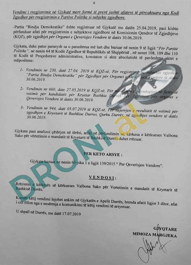 Seanca ka përfunduar vetëm pak minuta më parë. Argumenti i Gjykatës ka qenë se zgjedhjet janë të paligjshme. Kjo për shkak se sipas trupës gjykuese, Bindja Demokratike është regjistruar në zgjedhjet e 30 qershorit në shkelje me afatet ligjore.