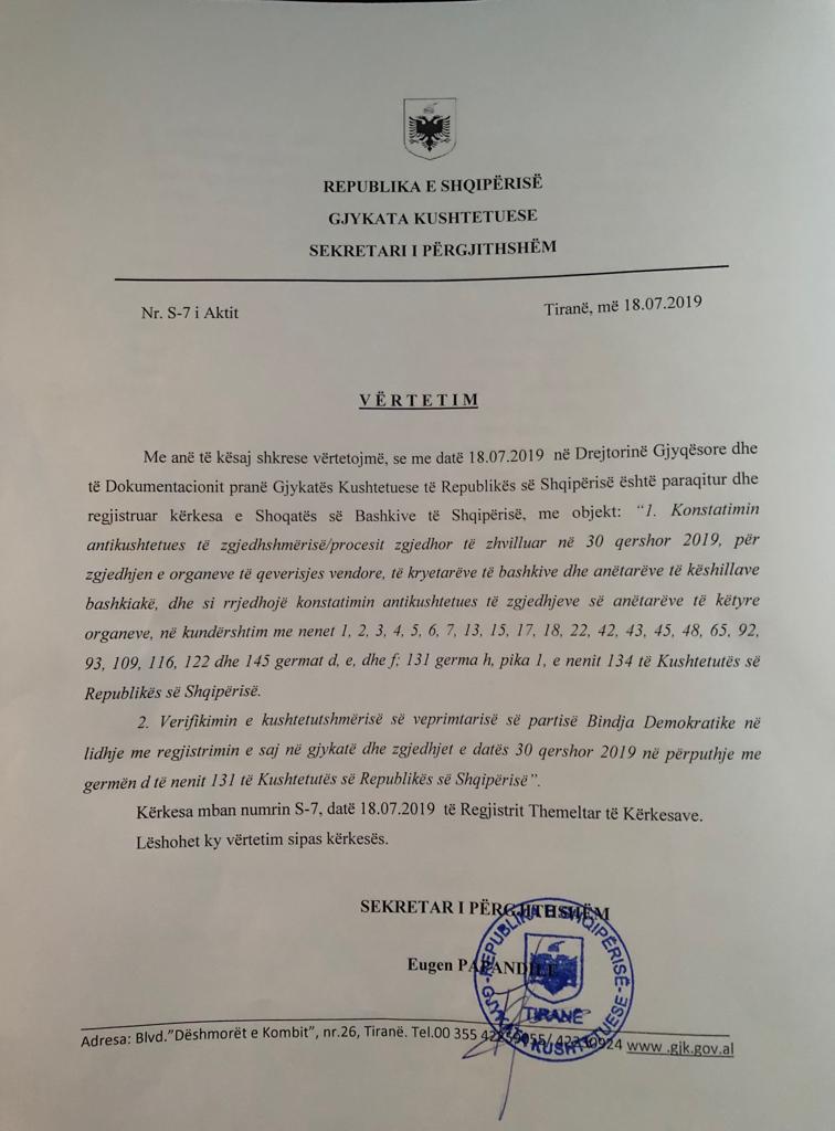 Vertetimi per dorezimin ne Gjykaten Kushtetuese te kerkeses se Shoqates se Bashkive te Shqiperise per: