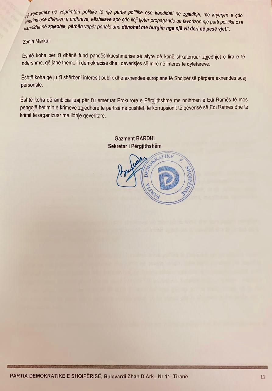 “Është koha që ambicia juaj për t’u emëruar Prokurore e Përgjithshme me ndihmën e Edi Ramës të mos pengojë hetimin e krimeve zgjedhore të partisë në pushtet, të korrupsionit të qeverisë së Edi Ramës dhe të krimit të organizuar me lidhje qeveritare.”- mbyllet letra e Sekretarit të Përgjithshëm të PD, Gazmet Bardhi”.