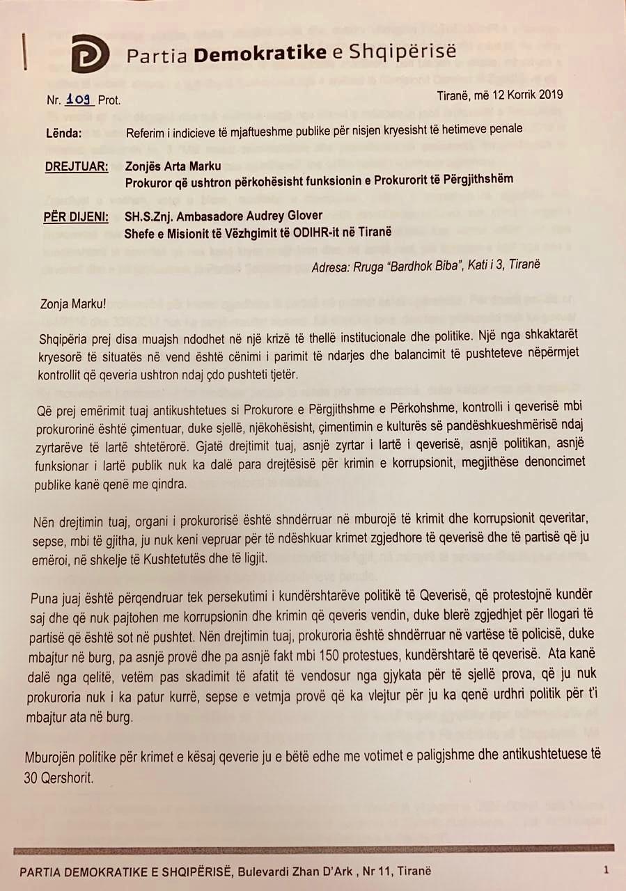 “Që prej emërimit tuaj antikushtetues si Prokurore e Përgjithshme e Përkohshme, kontrolli i qeverisë mbi prokurorinë është çimentuar, duke sjellë, njëkohësisht, çimentimin e kulturës së pandëshkueshmërisë ndaj zyrtarëve të lartë shtetërorë. Gjatë drejtimit tuaj, asnjë zyrtar i lartë i qeverisë, asnjë politikan, asnjë funksionar i lartë publik nuk ka dalë para drejtësisë për krimin e korrupsionit apo të krimeve zgjedhore, megjithëse denoncimet publike kanë qenë me qindra.” – thuhet në letrën e Sekretarit të Përgjithshëm të PD.