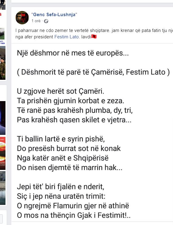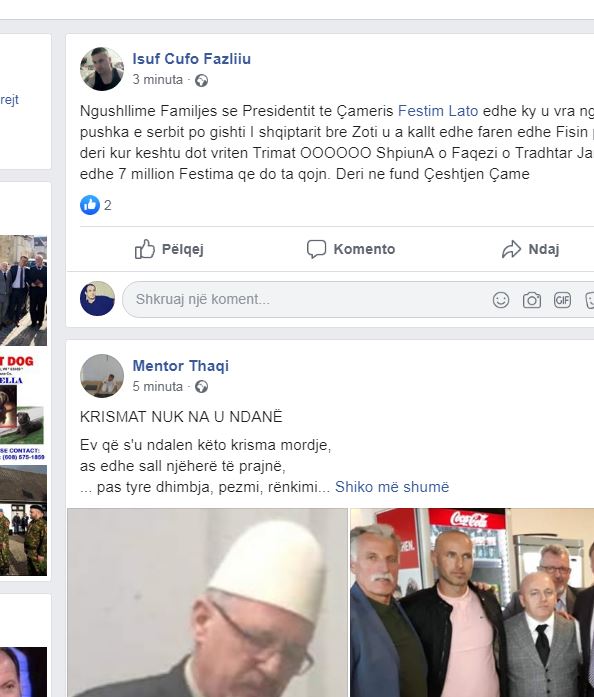 “Ngushëllime familjes të presidentit të Çamërisë z.Festim Lato. Edhe ky u vra nga pushka e serbit”, shprehet një komentues.