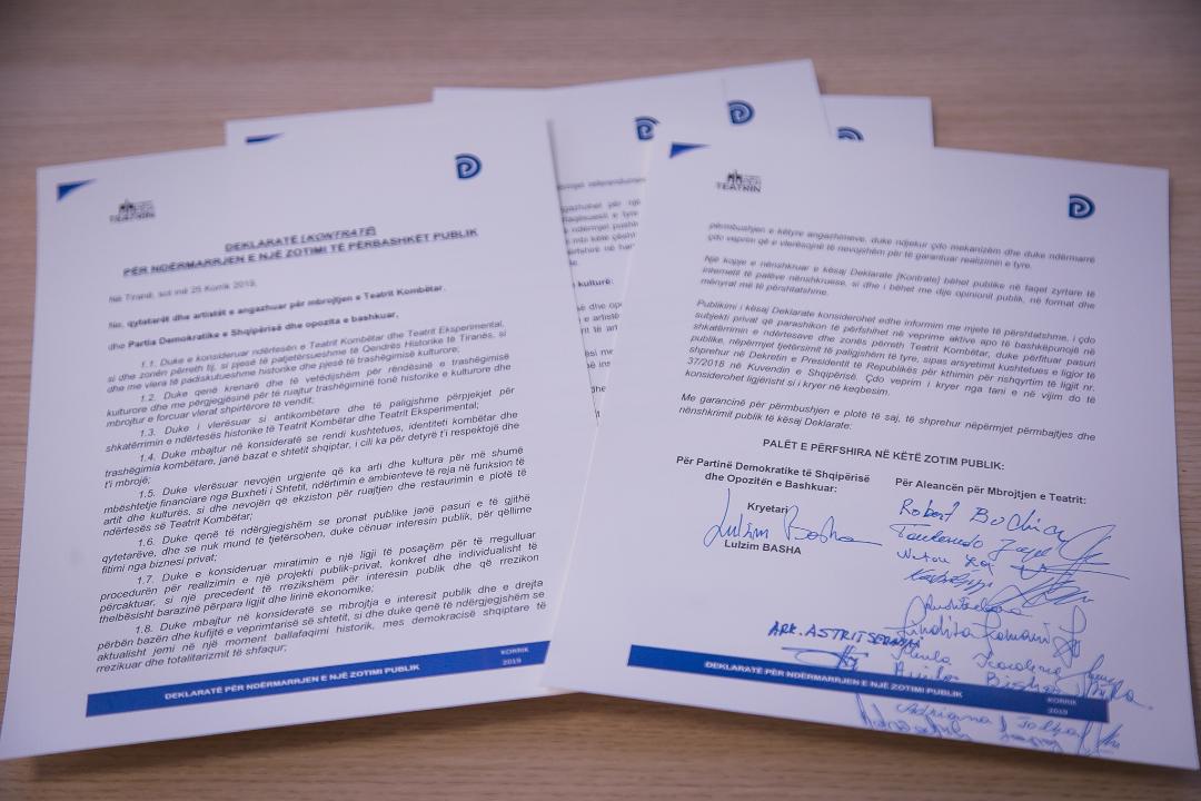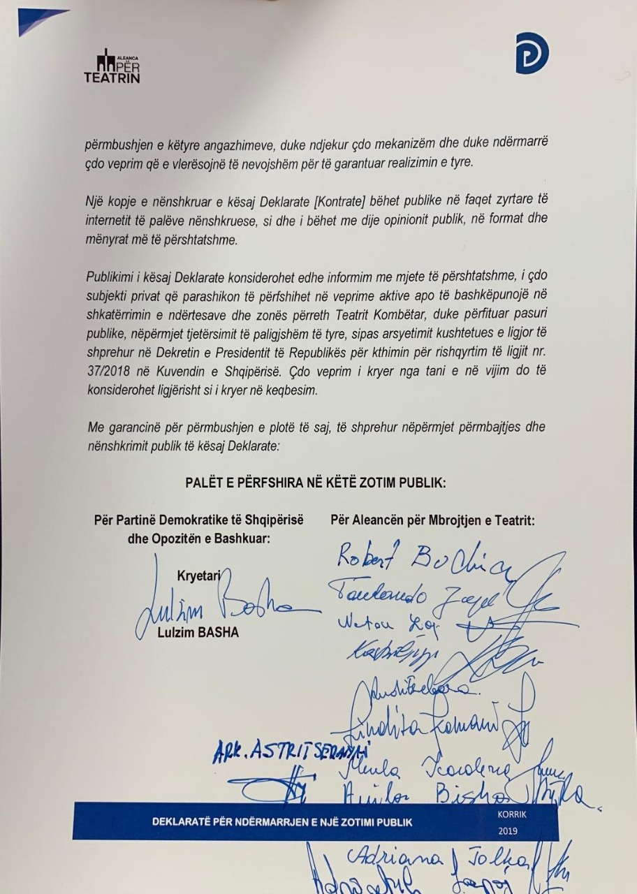 Përsa i përket çështjes së teatrit, kontrata përmban 6 pika, në të cilat Aleanca angazhohet të vijojë pa ndërprerje mbrojtjen për Teatrin, ndërsa PD dhe opozita për të mbështetur këto aksione në mbritje të ndërtesës dhe tëpronës publike.