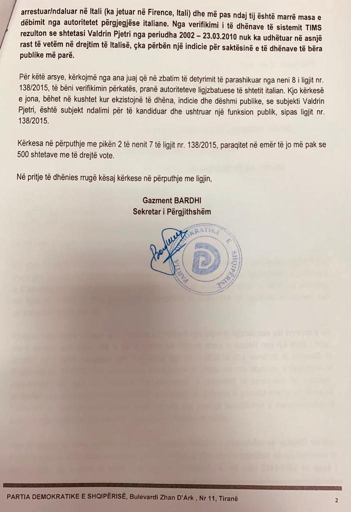 Kërkesa e firmosur nga Sekretari i Përgjithshëm i PD, Gazment Bardhi, bëhet në kushtet kur ekzistojnë të dhëna, indicie dhe dëshmi publike se Valdrin Pjetri nuk mund të ushtrojë funksion publik për shkak te ligjit të dekriminalizimit.