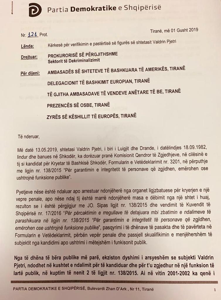 Partia Demokratike i ka kërkuar Prokurorisë së Përgjithshme të verifikojë pa vonesë pastërtinë e figurës së Valdrin Pjetrit, i cili u regjistruar në votime si kandidat i PS për Bashkinë e Shkodrës.
